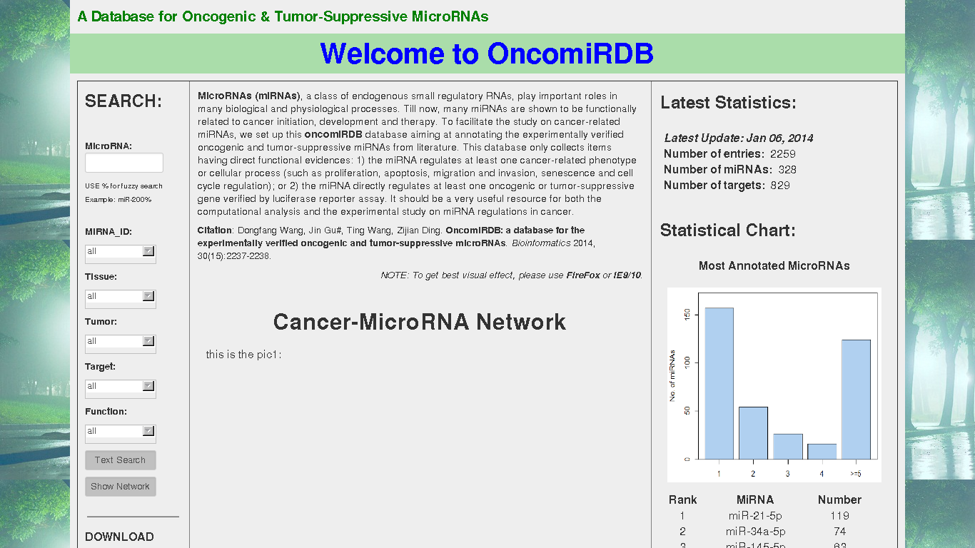 oncomiRDB database aimes at annotating the experimentally verified oncogenic and tumor-suppressive miRNAs from literature. This database only collects items having direct functional evidences: 1) the miRNA regulates at least one cancer-related phenotype or cellular process (such as proliferation, apoptosis, migration and invasion, senescence and cell cycle regulation); or 2) the miRNA directly regulates at least one oncogenic or tumor-suppressive gene verified by luciferase reporter assay.