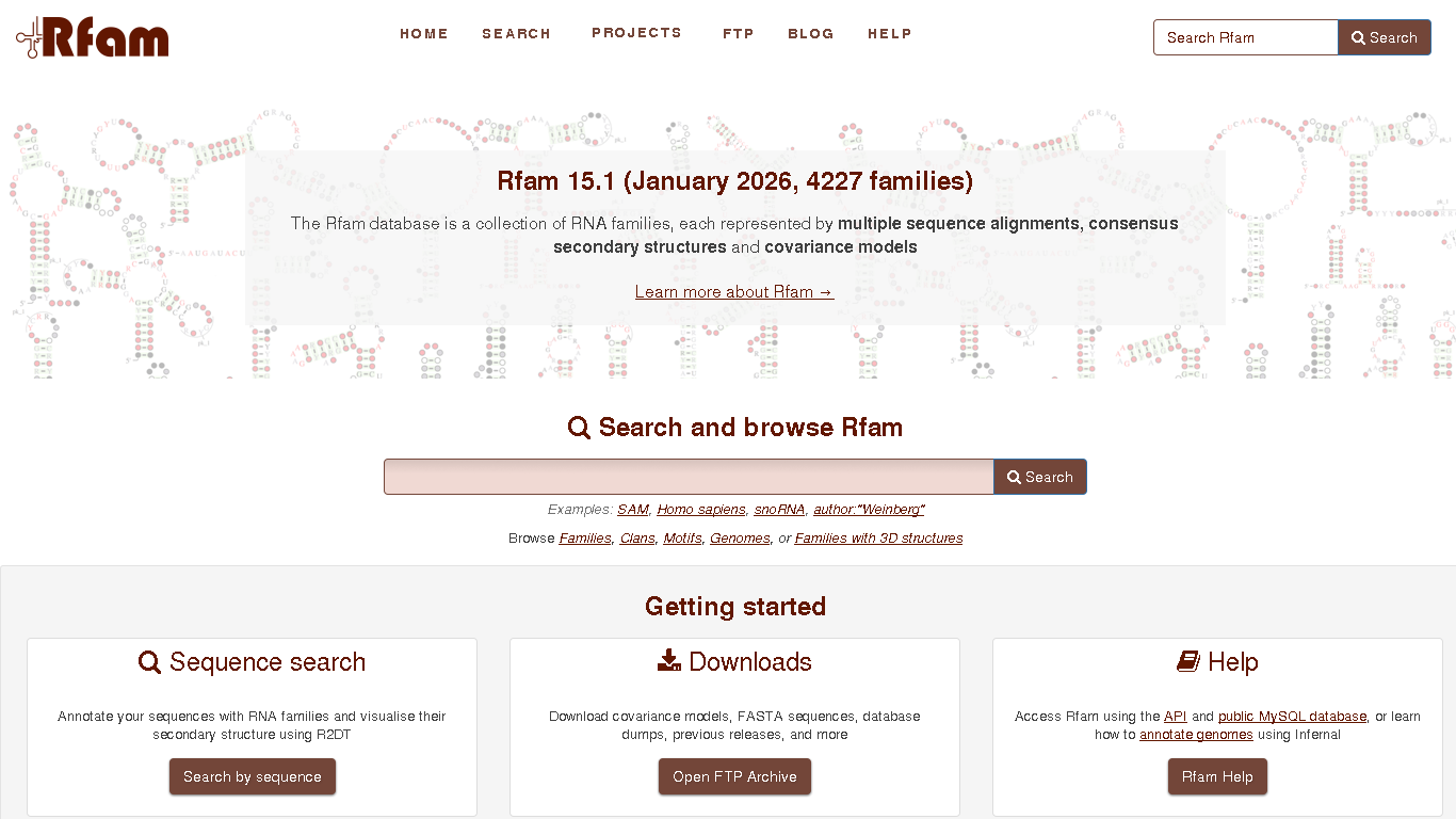 Rfam is the database of non-coding RNA (ncRNA) families (1), each represented by a multiple sequence alignment (known as the seed), a consensus secondary structure, and a covariance model to annotate non-coding RNAs in nucleotide datasets using the Infernal software.