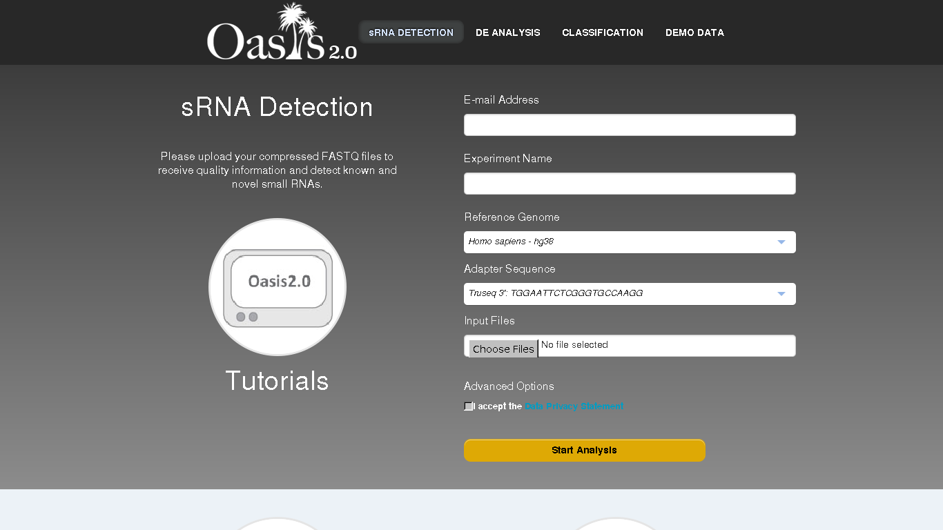Oasis is a web application that allows for the fast and flexible online analysis of small-RNA-seq (sRNA-seq) data. Oasis’ exclusive selling points are a differential expression module that allows for the multivariate analysis of samples, a classification module for robust biomarker detection and an advanced programming interface that supports the batch submission of jobs. Both modules include the analysis of novel miRNAs, miRNA targets and functional analyses including GO and pathway enrichment.