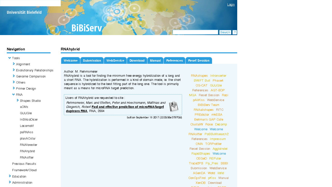 RNAhybrid is a tool for finding the minimum free energy hybridization of a long and a short RNA. The hybridization is performed in a kind of domain mode, ie. the short sequence is hybridized to the best fitting part of the long one. The tool is primarily meant as a means for microRNA target prediction.