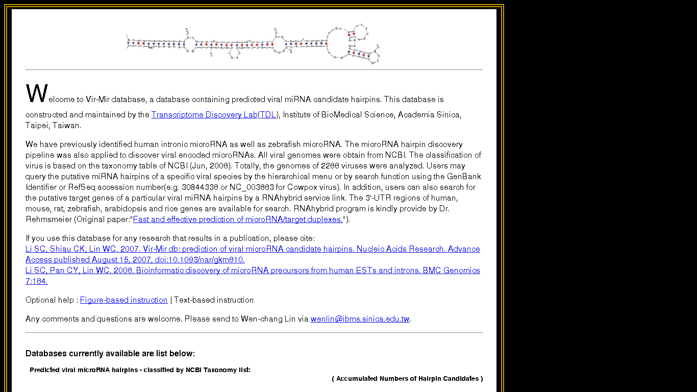Vir-Mir database, a database containing predicted viral miRNA candidate hairpins.