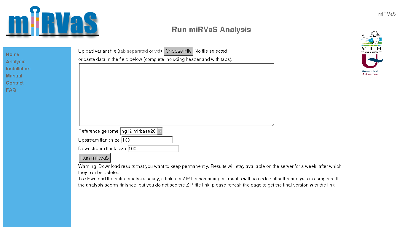 miRVaS predicts the impact of genetic variants on miRNAs. It annotates the location of the variant relative to functional regions within the miRNA hairpin (seed, mature, loop, hairpin arm, flanks) based on an accompanying database of miRNA genes with all functional regions.