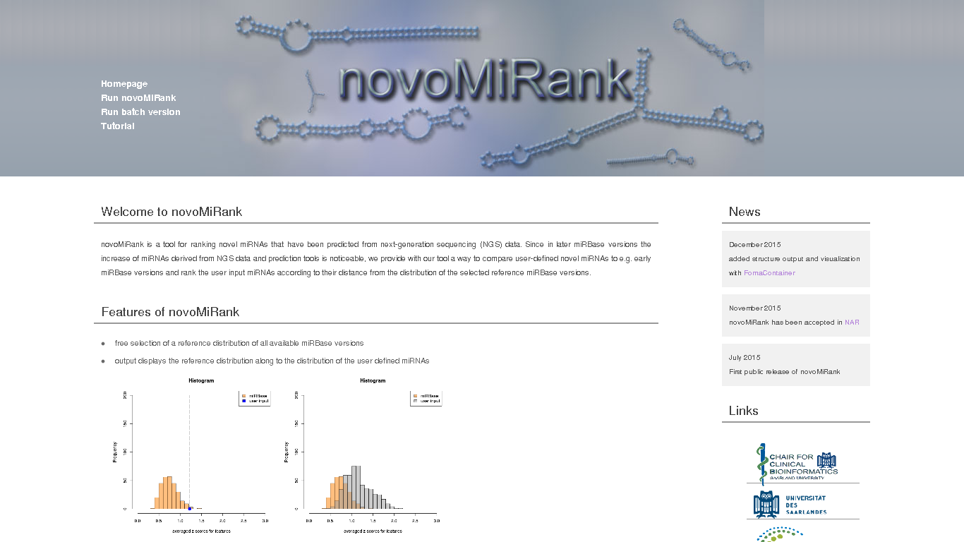 novoMiRank is a tool for ranking novel miRNAs that have been predicted from next-generation sequencing (NGS) data. Since in later miRBase versions the increase of miRNAs derived from NGS data and prediction tools is noticeable, we provide with our tool a way to compare user-defined novel miRNAs to e.g. early miRBase versions and rank the user input miRNAs according to their distance from the distribution of the selected reference miRBase versions.