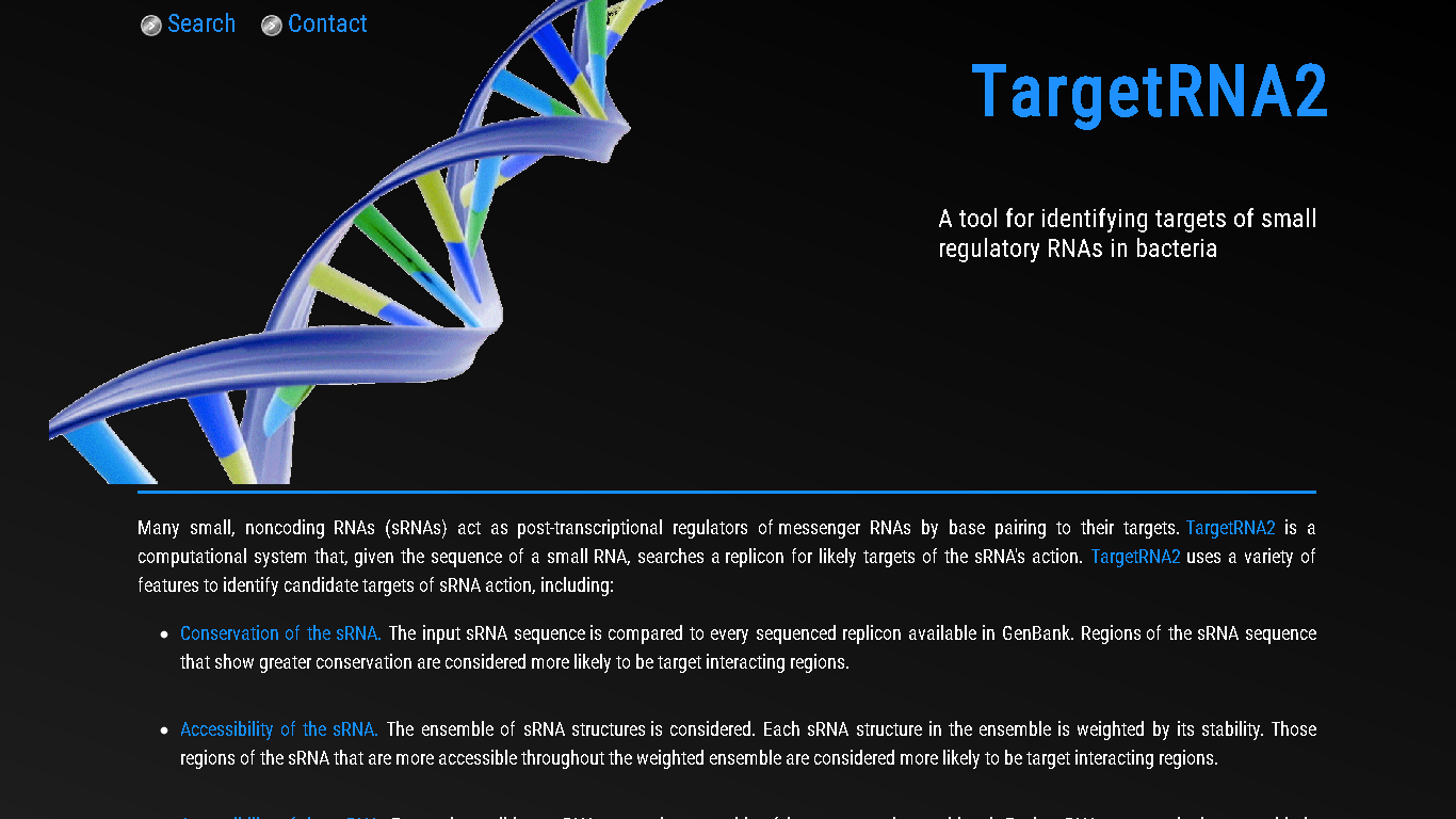 TargetRNA2 is a web server that identifies mRNA targets of sRNA regulatory action in bacteria. As input, TargetRNA2 takes the sequence of an sRNA and the name of a sequenced bacterial replicon. When searching for targets of RNA regulation, TargetRNA2 uses a variety of features, including conservation of the sRNA in other bacteria, the secondary structure of the sRNA, the secondary structure of each candidate mRNA target and the hybridization energy between the sRNA and each candidate mRNA target.