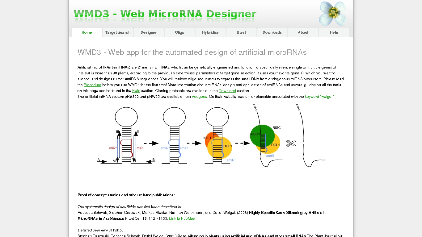 WMD3 - Web app for the automated design of artificial plant microRNAs. Platform requires only selection of favorite candidates according to a small set of criteria. It is designed to optimize both intrinsic small RNA properties as well as specificity within the given transcriptome.